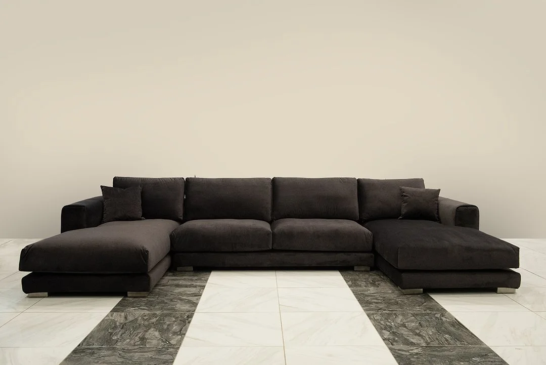 The fabric is Deluxe charcoal velvet with a 100,000 rub count, from Belgium. Made with a luxury firm seat, layered with down and feathers the Louis is the ultimate in cool, long lasting comfort. Available in endless configurations the sectional with a double chaise works for a busy family, in a tv watching room or just a relaxing space.