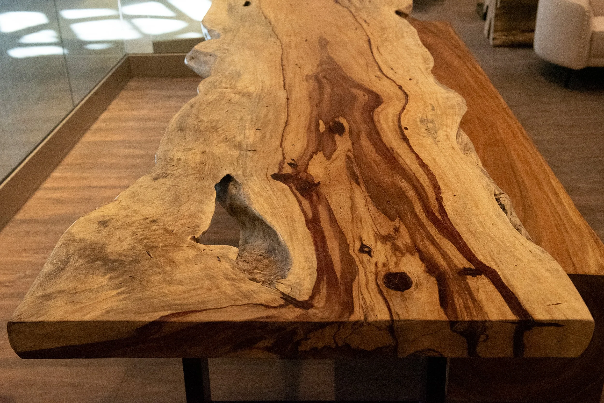 The wild, dramatic grains of the Majestic Tamarind Live Edge Dining Table.